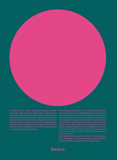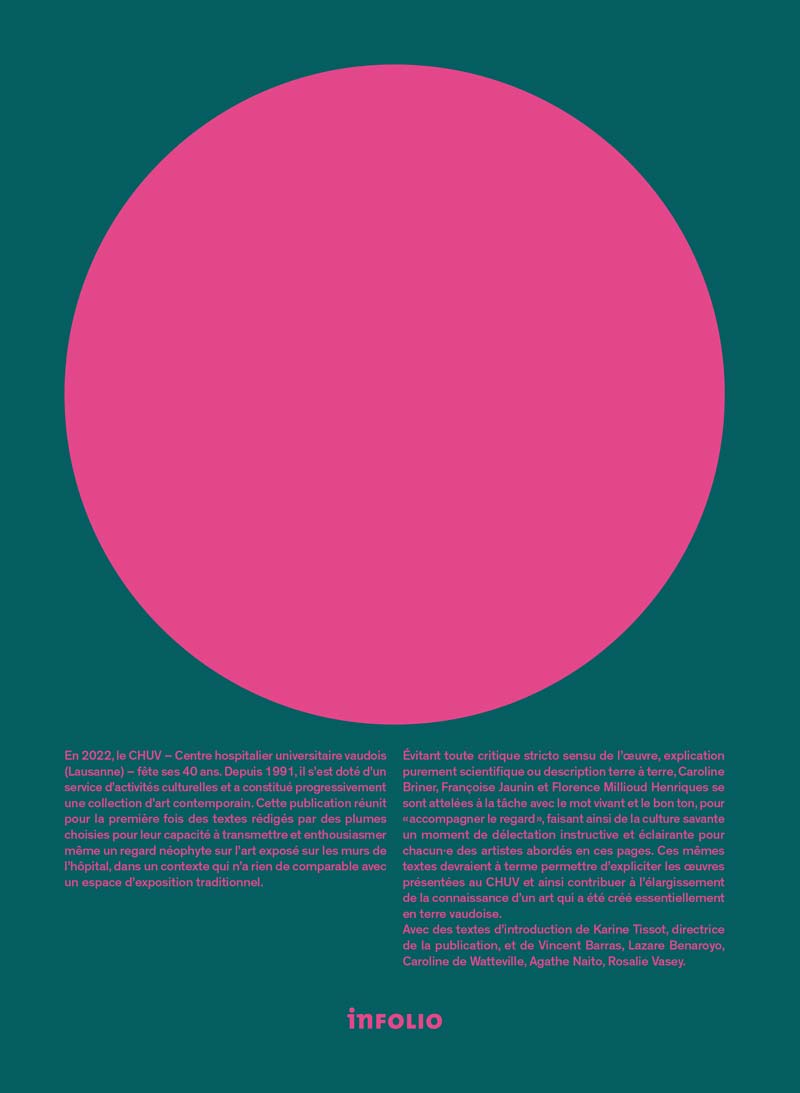 En 2022, le CHUV – Centre hospitalier universitaire vaudois – fête ses 40 ans. Depuis 1991, il s’est doté d’un service d’activités culturelles et a constitué progressivement une collection d’art contemporain qui compte désormais un millier de pièces. Cette publication réunit pour la première fois des textes rédigés par des plumes choisies pour leur capacité à transmettre et enthousiasmer même un regard néophyte sur l’art exposé sur les murs de l’hôpital, dans un contexte qui n’a rien de comparable avec un espace d’exposition traditionnel.